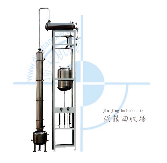 酒精回收塔由塔釜、塔身、冷凝器、冷卻器、緩沖罐、高位貯罐六個(gè)部分組成,適用于制藥、食品、輕工、化工等行業(yè)的稀酒精回收,本設(shè)備與物料接觸部分均采用0Gr19Ni9不銹鋼制造,具有良好的耐腐蝕性能,并且有節(jié)能、環(huán)保、降低生產(chǎn)成本、提高效率的優(yōu)點(diǎn)。本裝置可將30度~50度的稀酒精蒸餾到93度~95度,殘液排放含醇度底符合環(huán)保要求。
